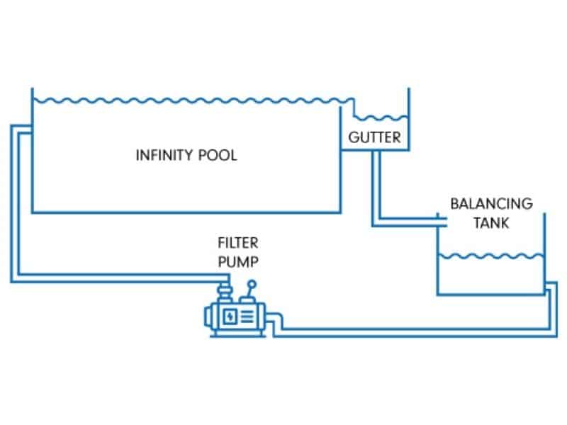 Una alberca infinita es una piscina diseñada con un borde desbordante oculto, donde el agua fluye hacia una canaleta de recuperación y regresa al sistema de filtración.